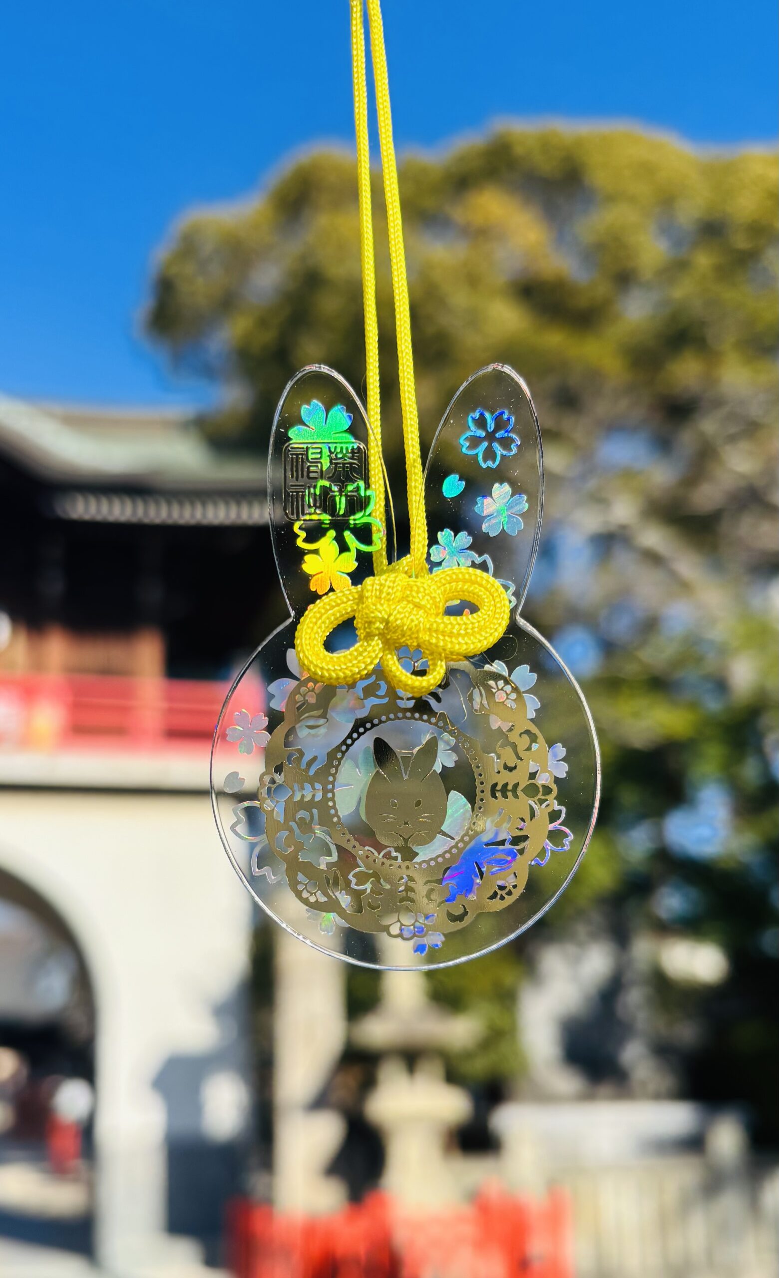 透明アクリル製で、当社のシンボルである「うさぎ」をあしらっております。ちなみに当社の代表的な御朱印「洗心」と同様のデザインとなっております。